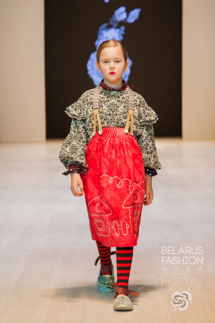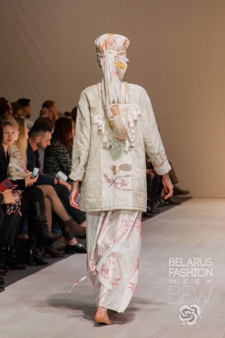 Natalla Kastrama in her collection “RODNAYA” concentrated a lot of folk motifs and refrain repeated the illustrations to the Belarusian folk tales in applications, artistic stitch and textured printed design.