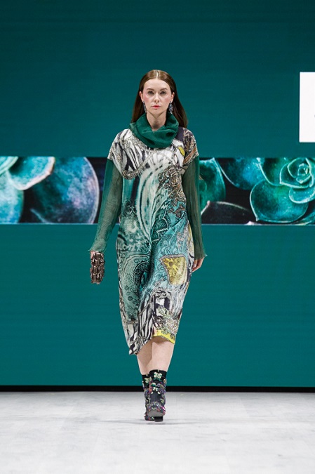 Коллекция делится на 2 капсулы. Первая – опалово-голубая, вторая – изумрудно-синяя. Выглядит очень по-осеннему. В цветовой гамме преобладают темно-зеленые, темно-синие, опалово-розовые тона. Ярко-голубой оттенок используется в качестве акцента. Дизайнер использует эксклюзивные натуральные ткани и создает из них классические и изысканные модели. Свободные трикотажные кардиганы и пальто из кашемира отлично сочетаются с женственными платьями с декоративными воланами, юбками миди из натурального шелка и широкими брюками. Во всех образах читаются отсылки к сказкам Павла Бажова, а именно к его Медной горы Хозяйке.