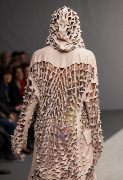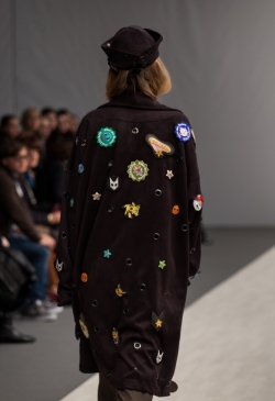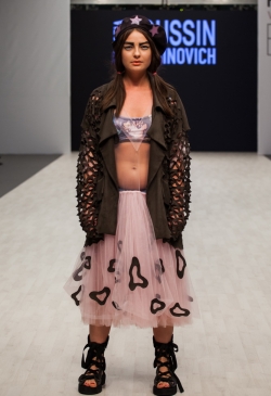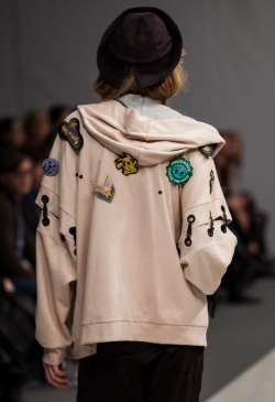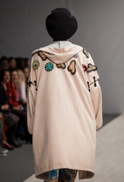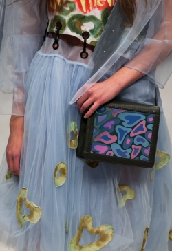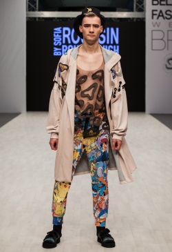 Коллекция выполнена с использованием военной тематики: замша защитного цвета с резьбой ручной работы, как маскировочная сетка, и грубая обувь, напоминающая берцы. Легкие цветные платья, вышитые защитными пятнами, создают впечатление камуфляжной ткани. А розовая и голубая цветовая гамма выступает символом пренебрежительного, насмешливого, а иногда и равнодушного, отношения людей к войне. Дополняет образы яркая нательная одежда с изображением супер-героев.